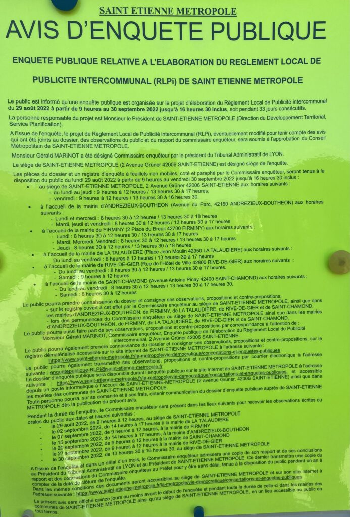 Non classé AVIS D’ENQUETE PUBLIQUE par f.bonhomme|Publié 6 juillet 2022 Enquête publique relative à l’élaboration du règlement local de publicité intercommunal (RLPI) de Saint Etienne Métropole