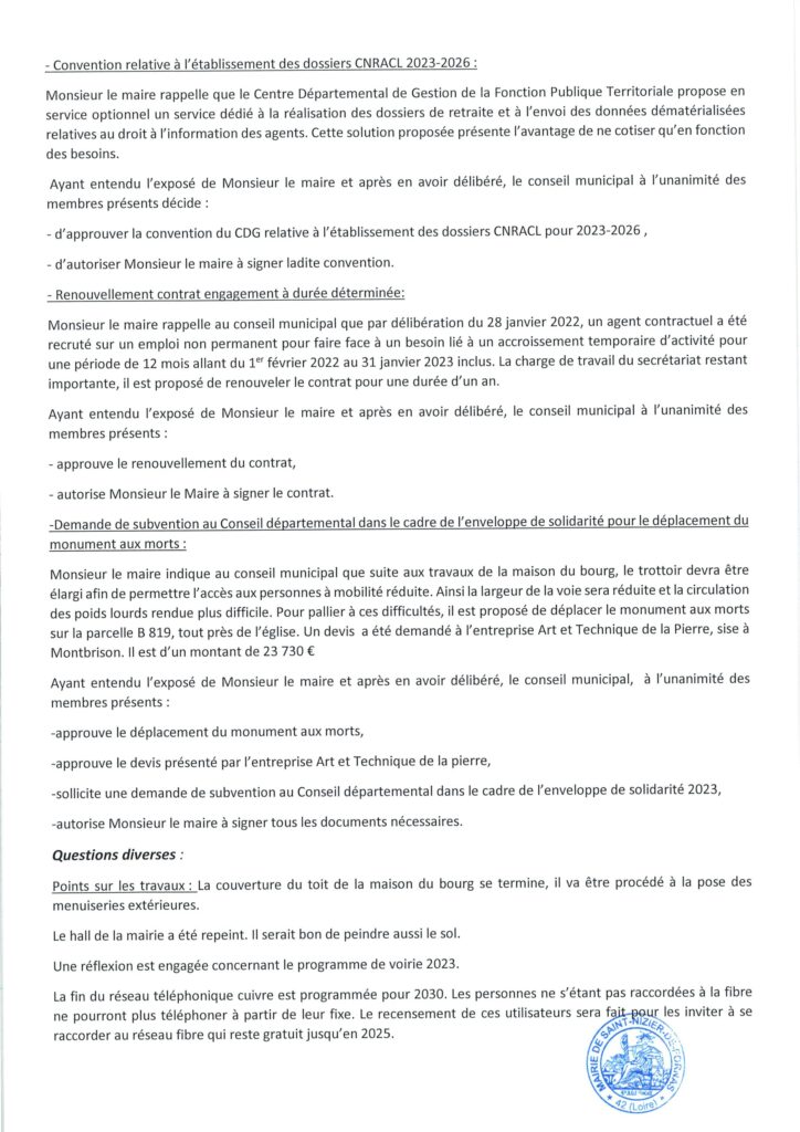 DELIBERATIONS Acquisition immobilière au Bourg Le conseil municipal autorise Mr le Maire à signer tous les documents concernant l’acquisition immobilière. Cette délibération […]