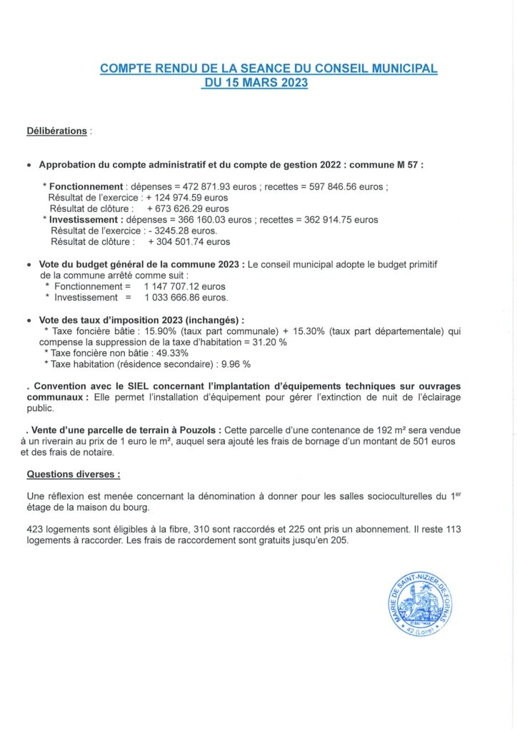 L’an deux mil vingt-deux à vingt heures trente, le Conseil Municipal, dûment convoqué, s’est réuni en session ordinaire en mairie de Saint-Nizier-de-Fornas, […]