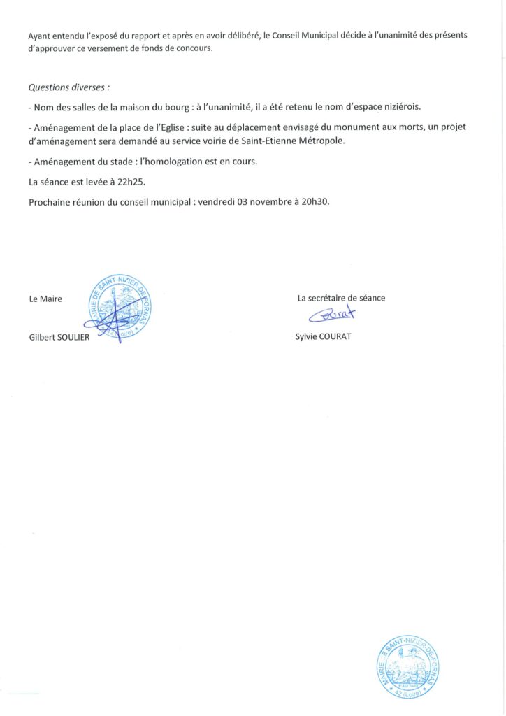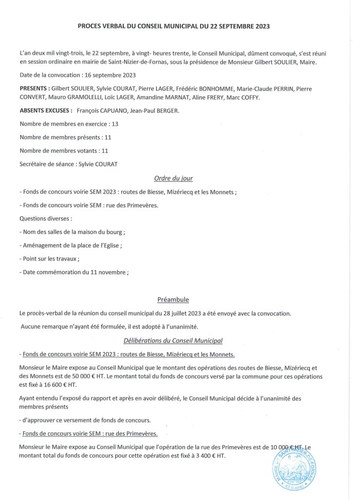 Conseils municipaux Non classé PROCES VERBAL DU CONSEIL MUNICIPAL DU 22 SEPTEMBRE 2023 par Marc Coffy|Publié novembre 22, 2023