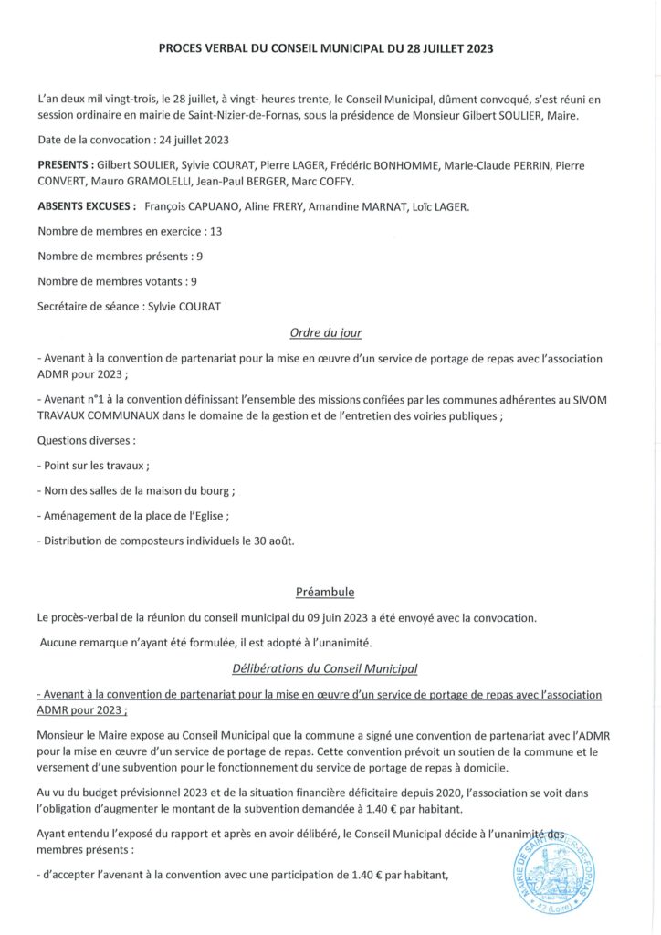 Conseils municipaux PROCES VERBAL DU CONSEIL MUNICIPAL DU 28 JUILLET 2023 par Marc Coffy|Publié novembre 22, 2023